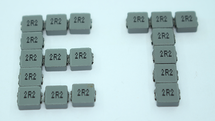 數碼表示法有點像文字符號表示法,只不過這是用三位數字來表示電感量的方法,其中從左數起,前面兩位是有效數字,最后一位表示有效數字后面加“0”的個數,單位是微亨(μH),多見于小功率貼片式電感上面。如圖標示為“2R2”的電感量為2.2μH。